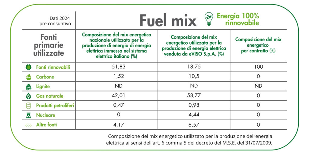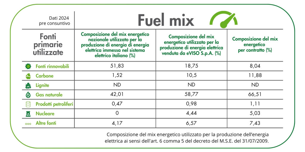 Nelle tabelle che seguono sono riportate le informazioni relative alla composizione del Mix Medio Nazionale di Combustibili utilizzati per la produzione dell’energia elettrica immessa nel sistema elettrico italiano nell’anno 2023, e alla composizione del Mix di fonti energetiche primarie utilizzate per la produzione dell’energia elettrica fornita da eVISO SpA nel 2023, sono riportate nelle tabelle che seguono; esse sono rese disponibili anche nel materiale informativo in fase pre-contrattuale e nelle bollette di energia elettrica.